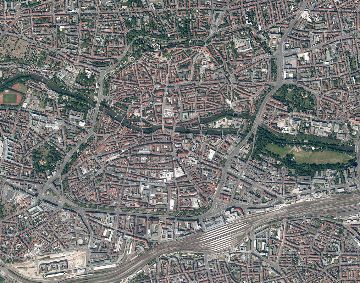Digitales Orthophoto von Nürnberg aus dem Jahr 2023. Die Basteien an der Burg (im Norden) wurden zwischen 1538 und 45 erbaut.
